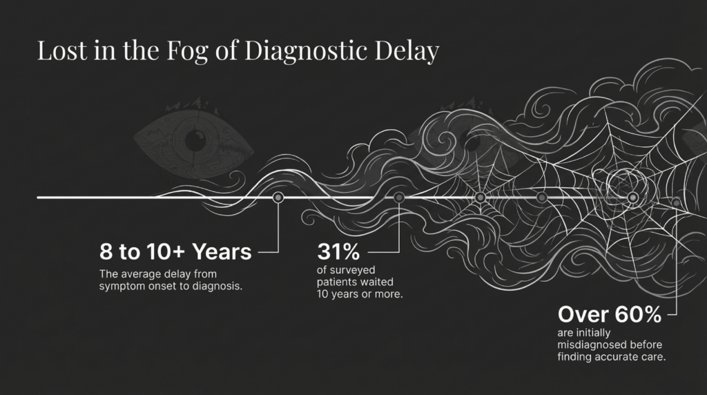 - The Wait: The average delay from symptom onset to diagnosis is 8 to 10+ years.